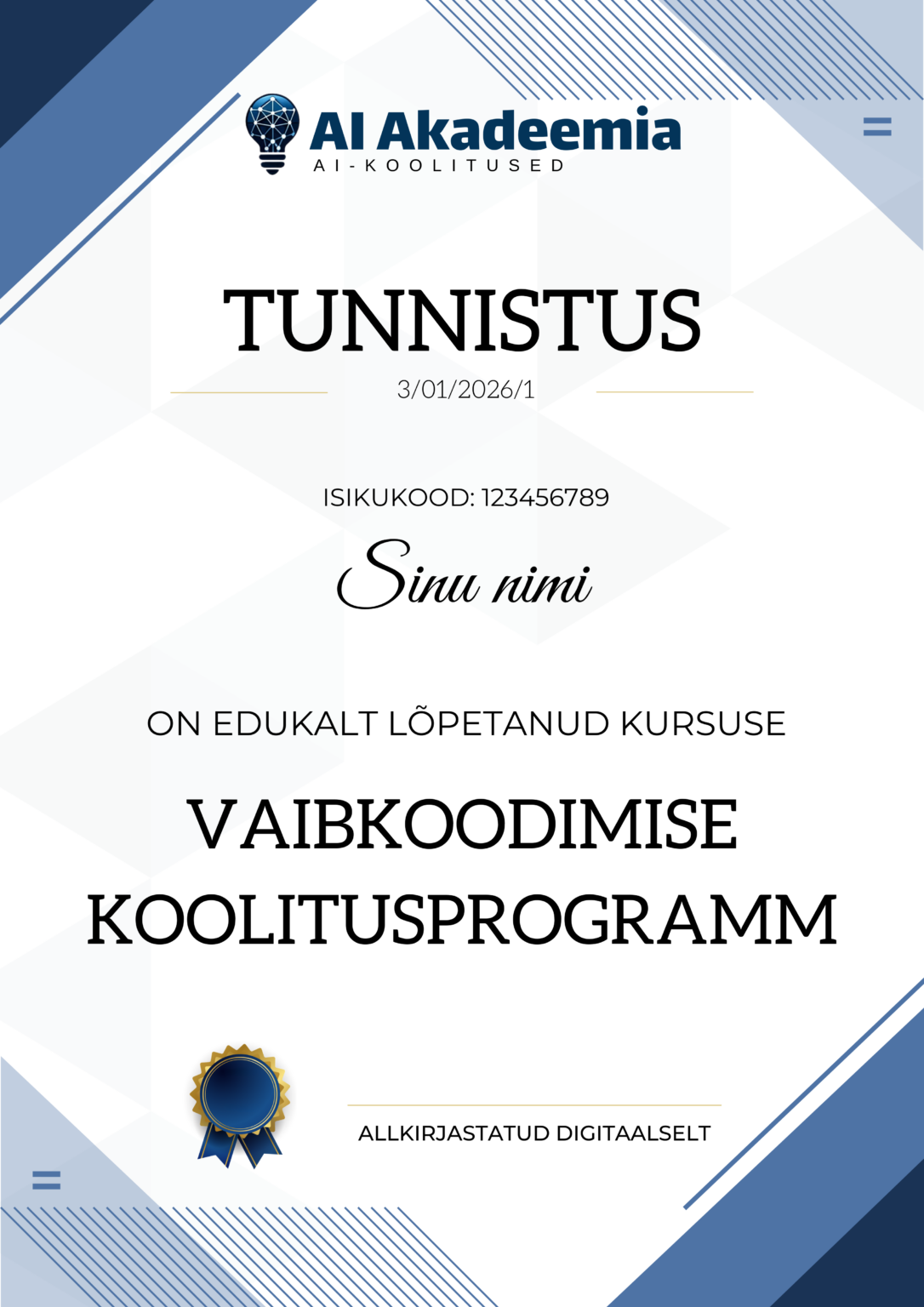 Tunnistuse saad pärast koolituse lõpetamist. Kõik, kes on koolituse läbi teinud (teinud ära AI teadmiste testi, mida saab teha soovi korral mitu korda), nendele saadame meilile AI Akadeemia koolituse tunnistuse. Tunnistus tõendab sinu AI oskusi, mille saad soovi korral lisada oma CV-sse.